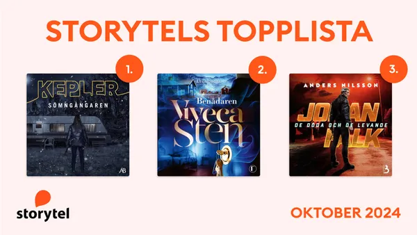 På listan över oktober månads mest lyssnade och lästa titlar på Storytel Sverige märks suget efter gastkramande historier i höstmörkret. Lars Kepler, vars titel Spegelmannen har fått flest “läskig”-emojis någonsin av Storytels användare, toppar listan med den senaste Joona Linna-deckaren Sömngångaren. Månadens näst mest populära titel är Viveca Stens Benådaren, följd av Anders Nilssons De döda och de levande.